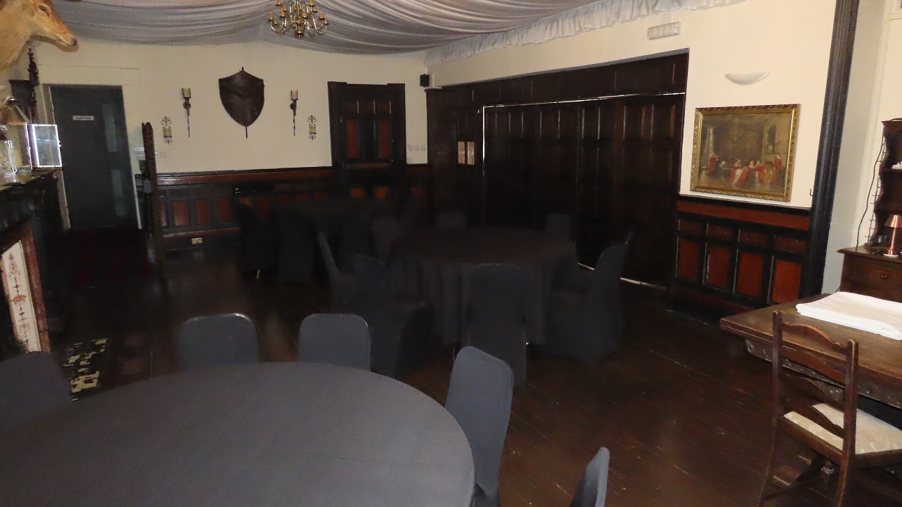 Function Room – L shaped room that can be divided in two, with a mixture of wood and carpeted floor coverings, feature fireplace and some wood panelling to the walls.