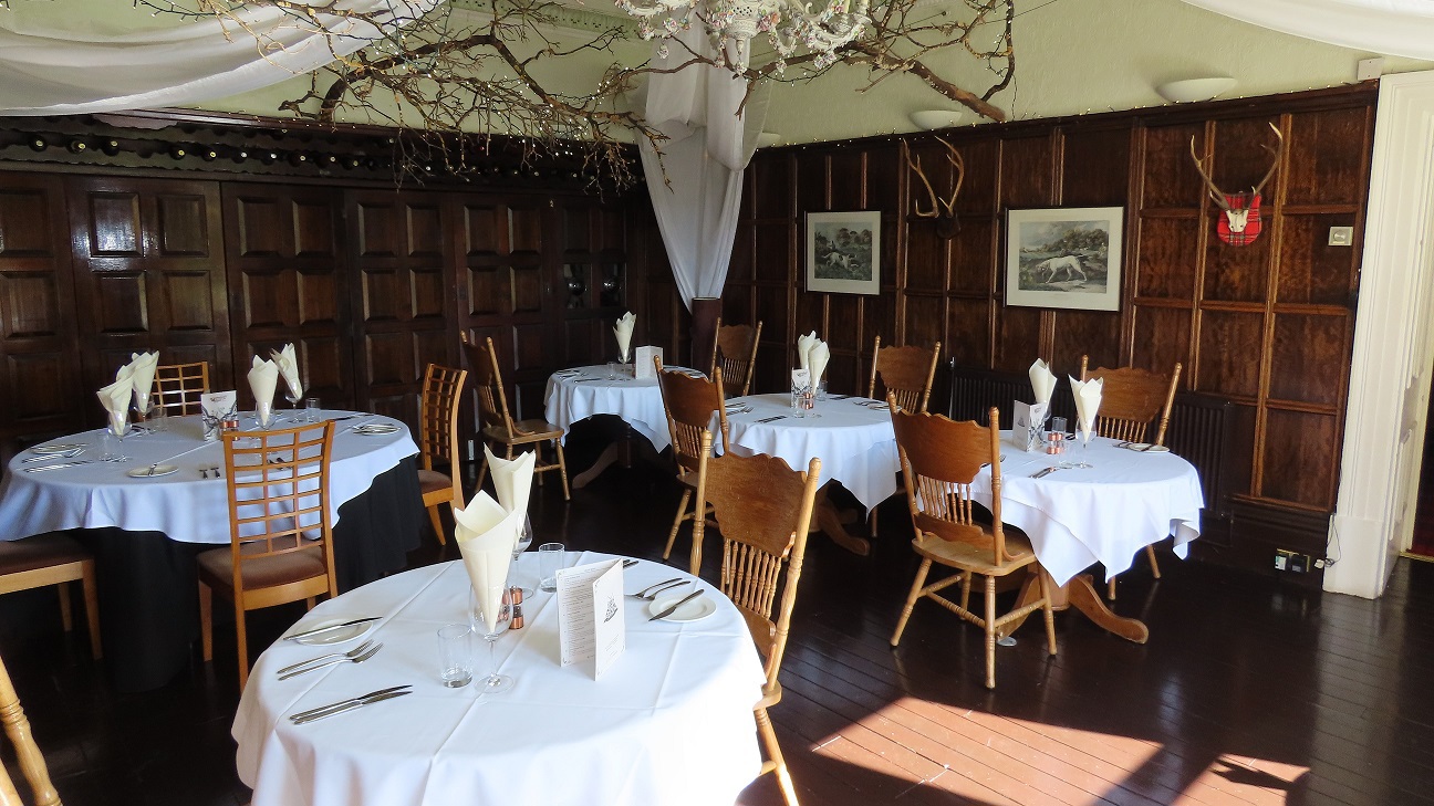 Restaurant – Wood flooring and paneling with extensive ceiling rose and coving and fireplace with living flame gas fire.