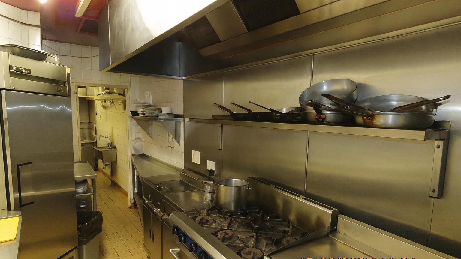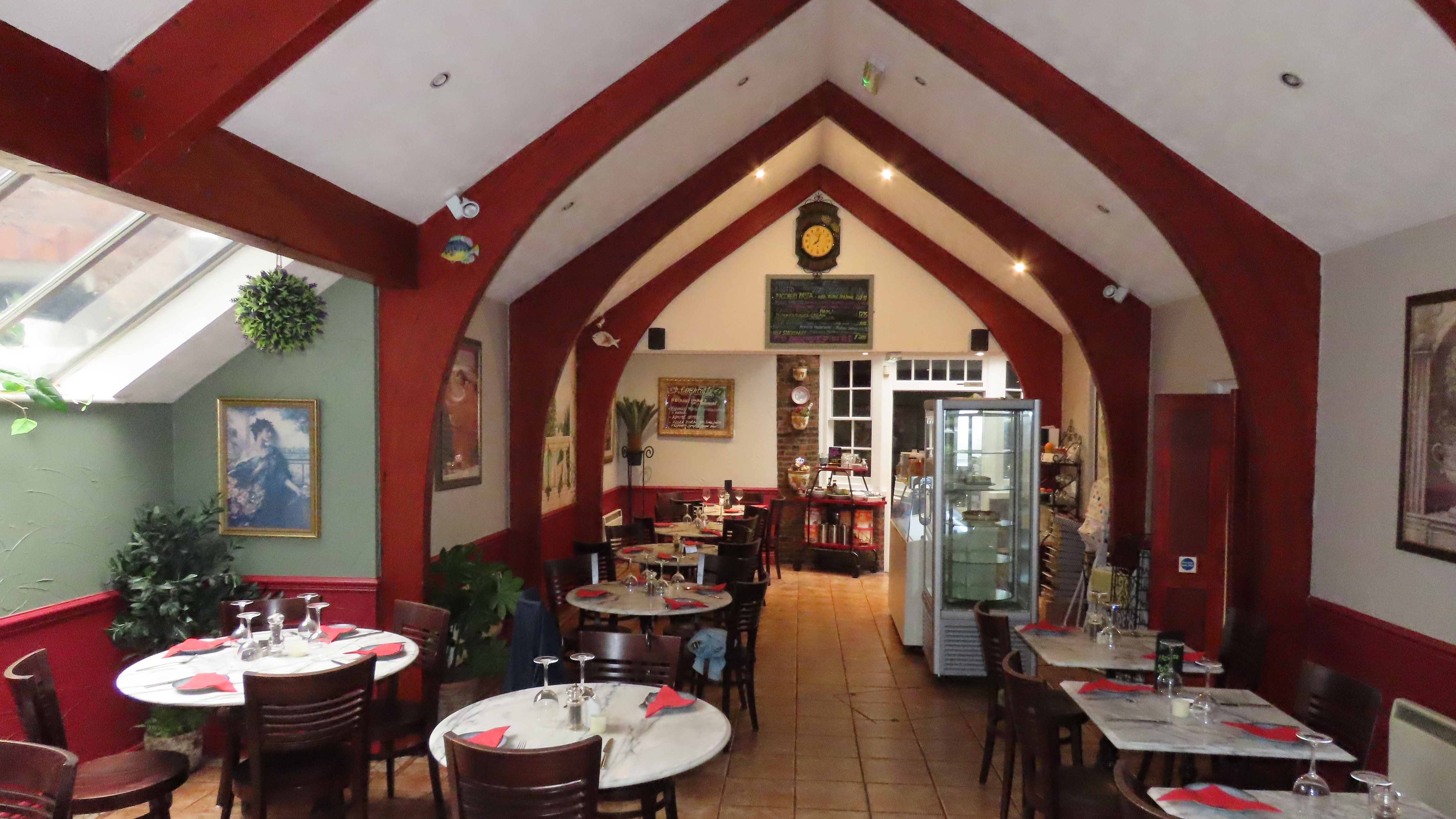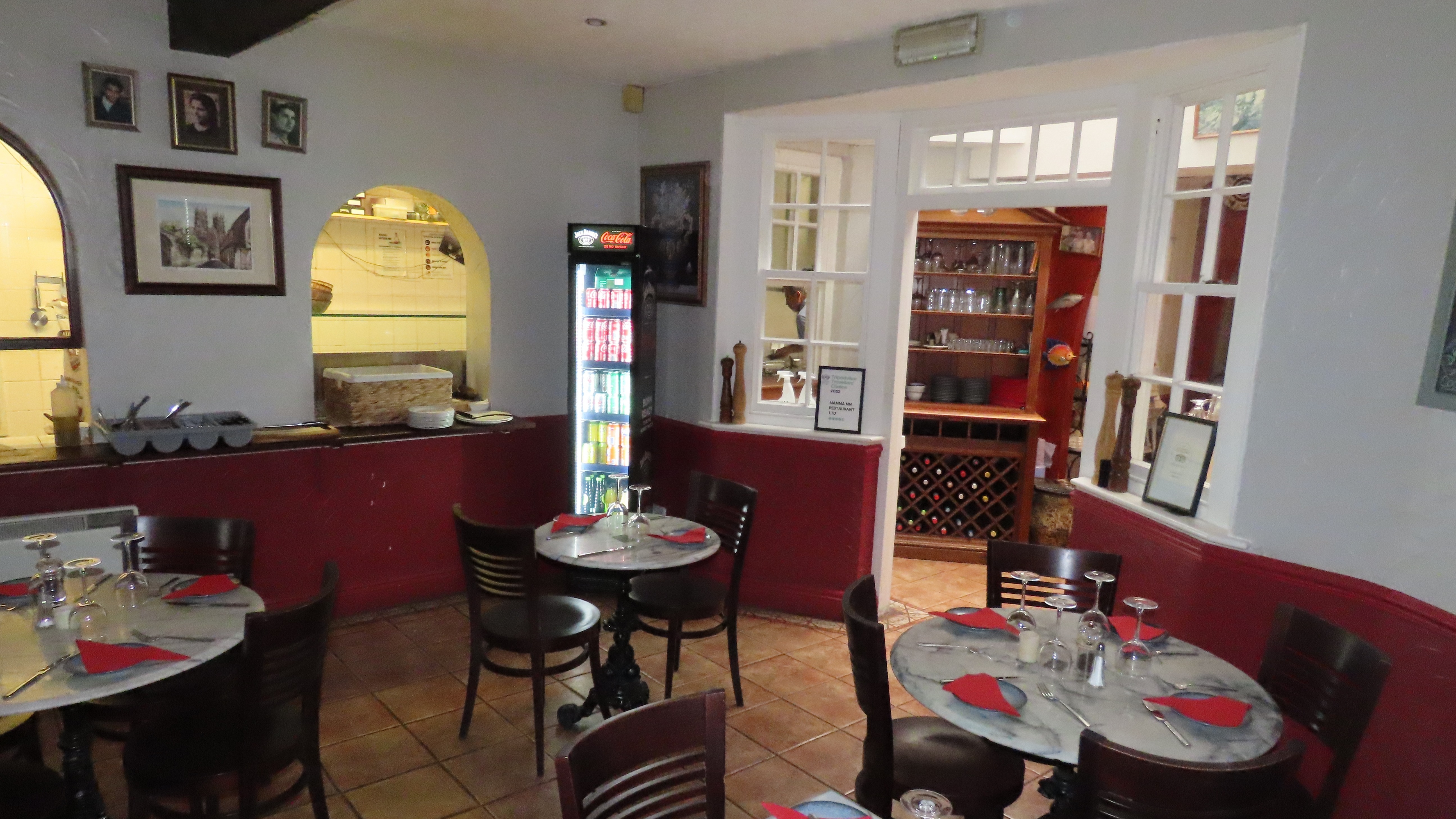 An archway leads through into a further dining space for an additional 12 covers. The decor is consistent with the same tiled flooring and seating. The pass is located in this area.