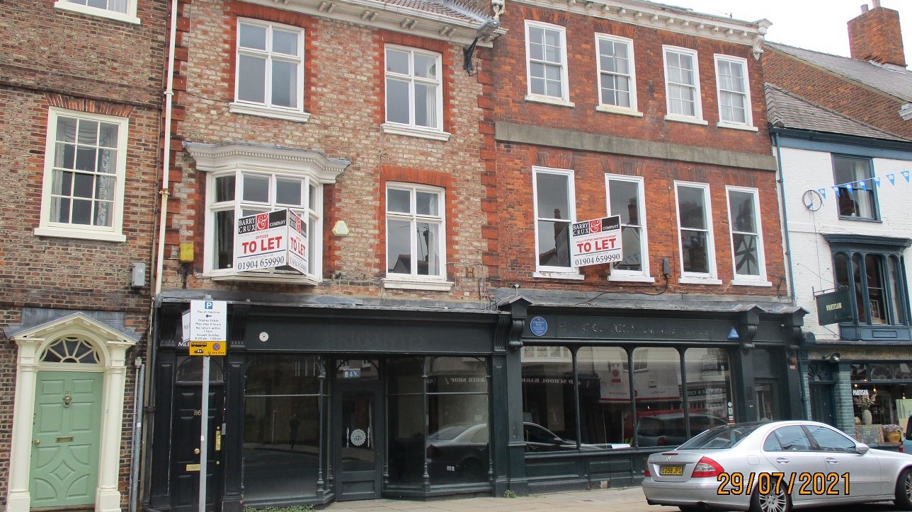 The substantial three story storey brick façade with glazed display windows and entrance doors to Micklegate. Sizeable basement. Access to rear yard. Toft Green frontage – two storey façade with the delivery entrance to street extending to rear with single story storage space plus in a two storey section with former lounge bar. Rear yard area with outbuildings.