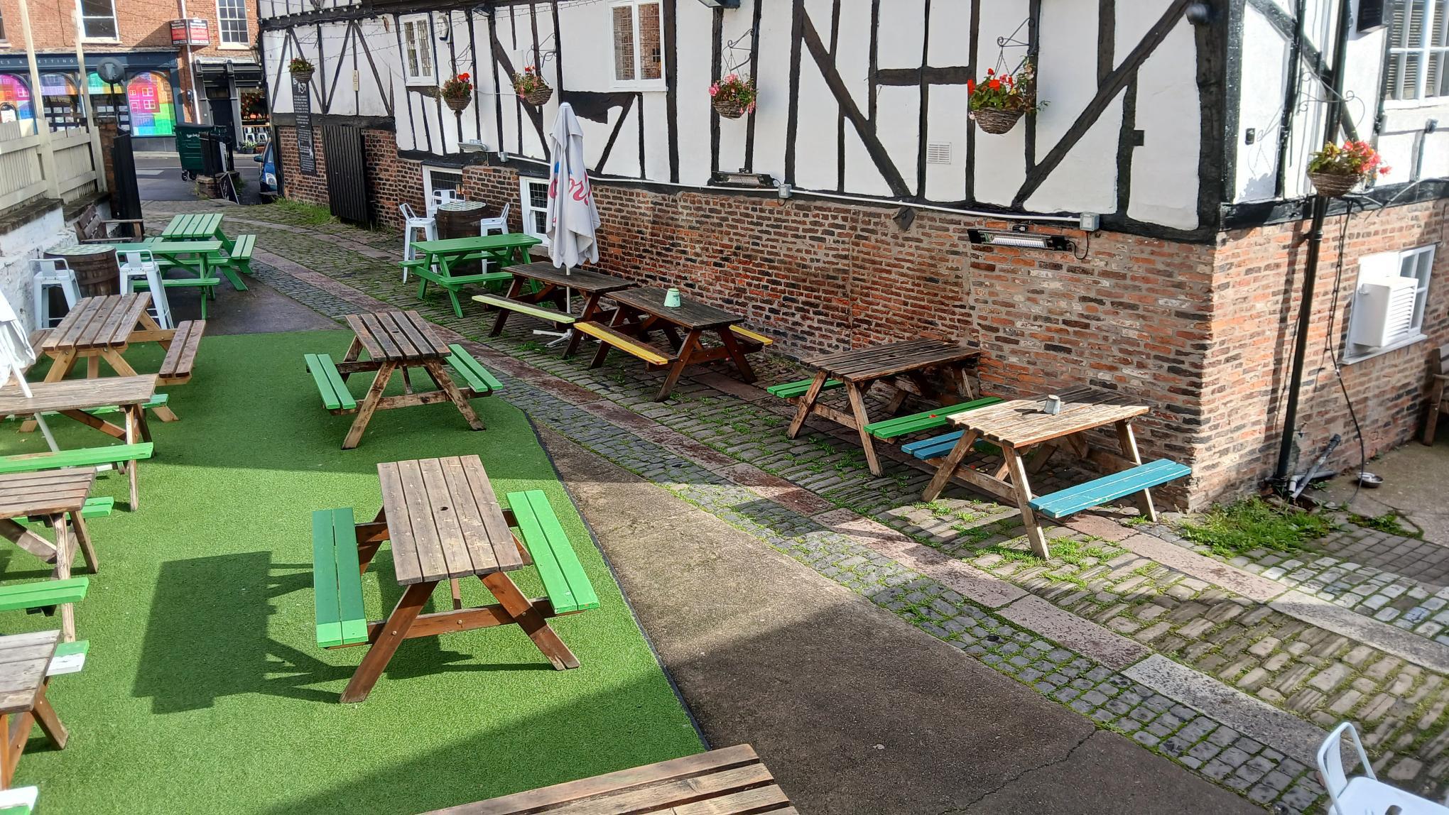 Ample outside split level beer garden with seating on picnic benches and incorporating two covered smoking shelters.